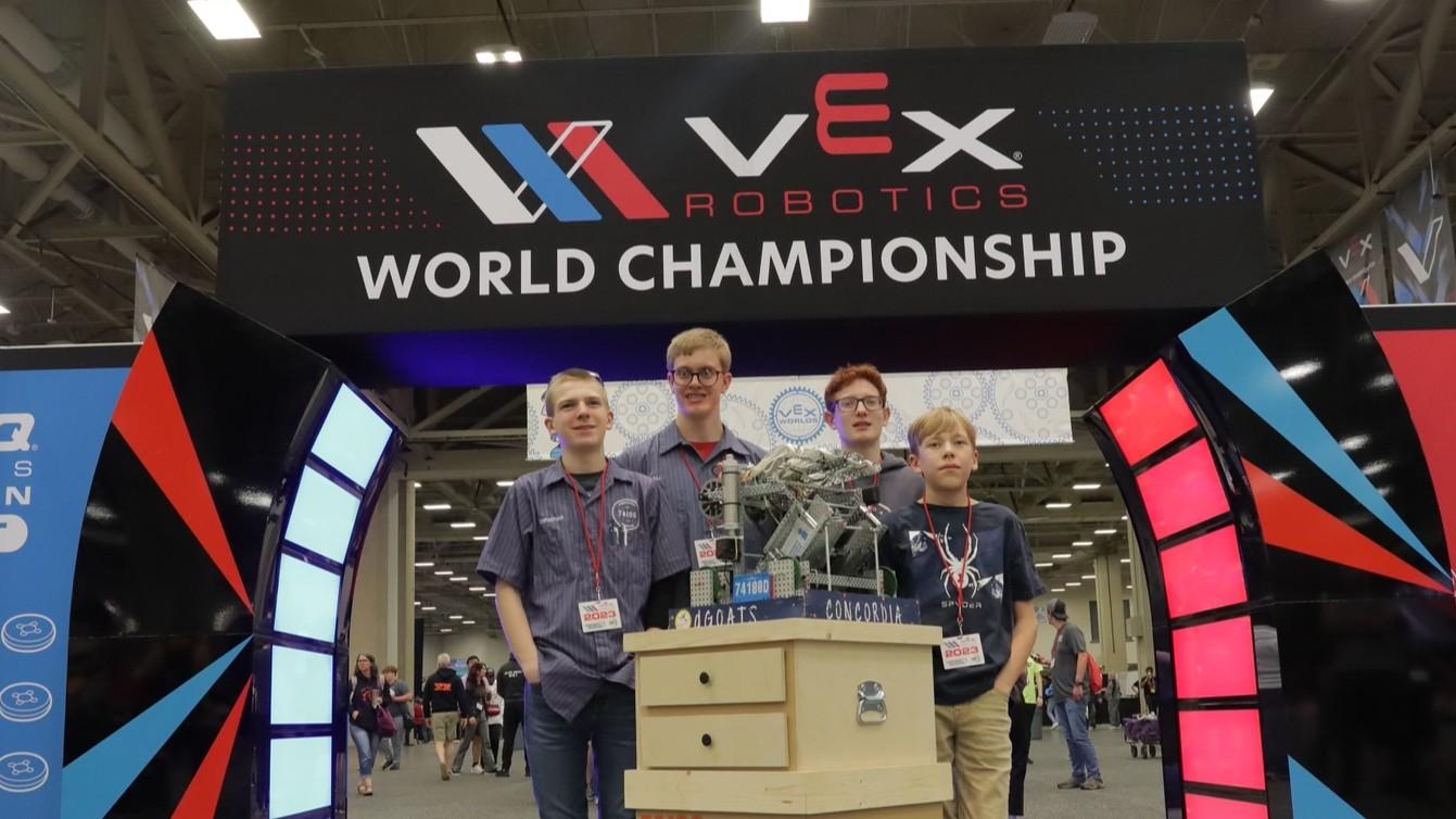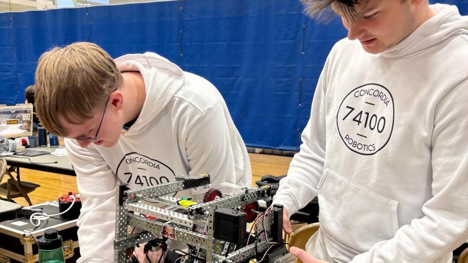 Concordia supports multiple teams of 6th-grade through 12th-grade students' participation in the VEX V5 Robotics Competition as an extension of our mission to prepare faith-secure, world-ready, kingdom leaders. Students follow the design process to create, build, and compete with a robot; in the process, they develop skills in basic engineering and design as they develop teamwork, problem-solving, and technical skills. The program also supports students as they investigate their passion for STEM and connected educational and career paths. Concordia teams participate in local, regional, and global competitions annually.