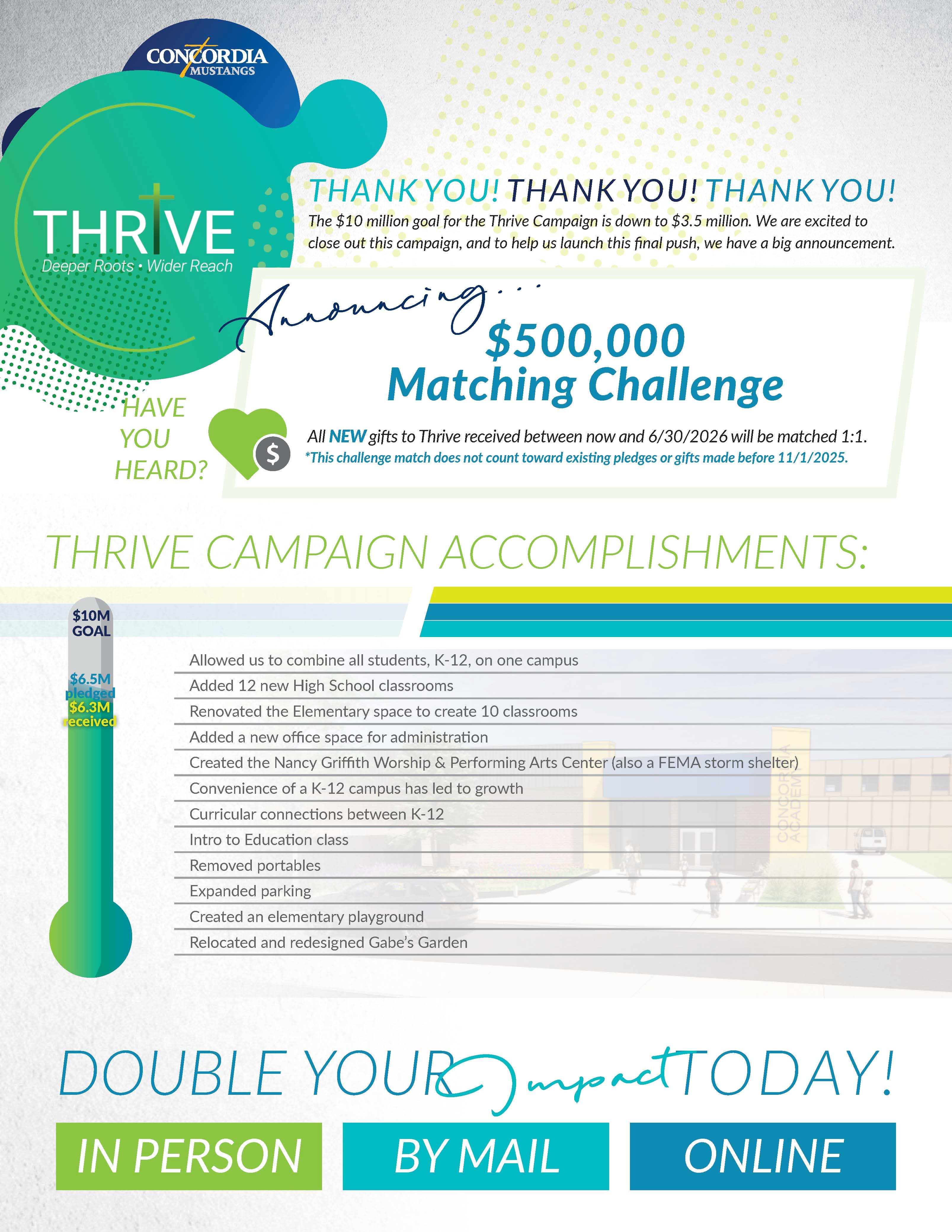 The Thrive Campaign has over $6.5 million pledged toward the goal of $10 million. $6.4 million has been received and we have less than $3.5 million to go to close out this campaign.